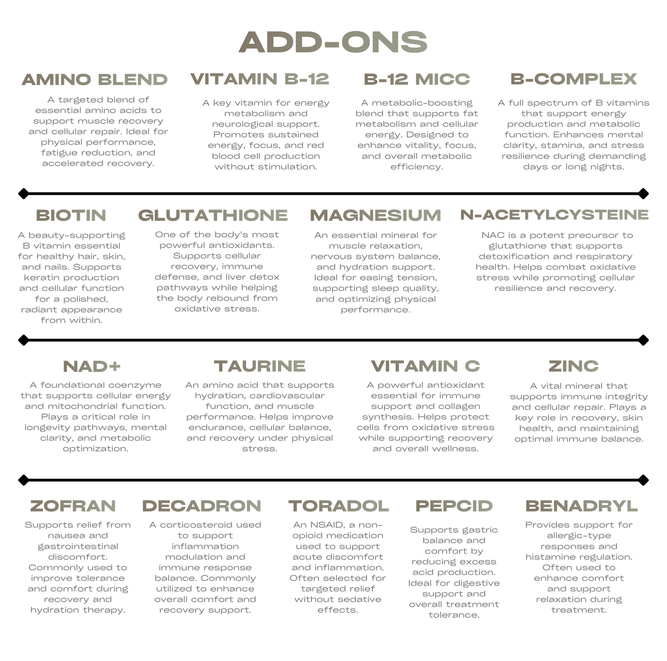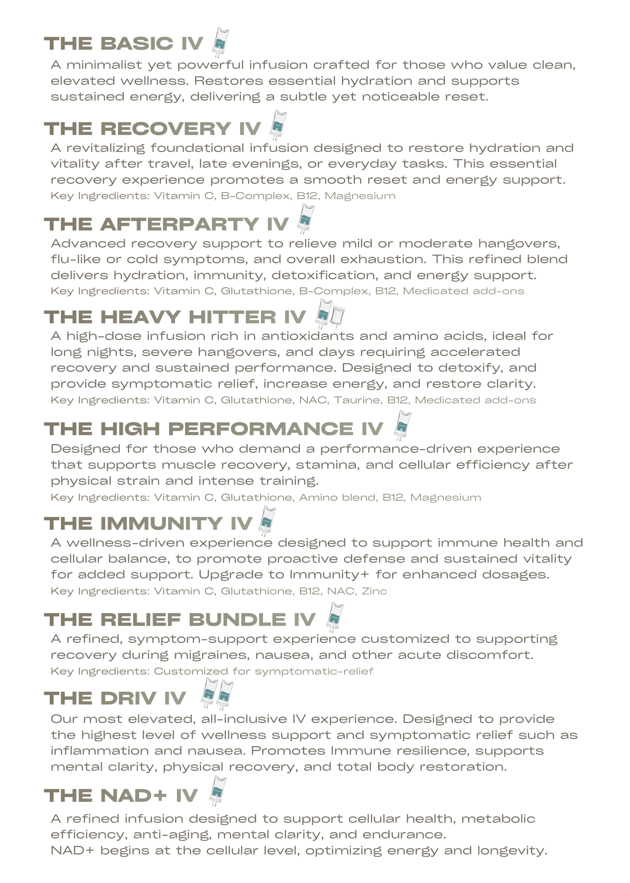 Our featured packages highlight the most requested IV experiences at DRIV. While these selections represent our signature offerings, we provide a full range of specialized infusions tailored to distinct wellness goals. Each package is thoughtfully designed to support specific outcomes, from proactive wellness and preventative care to recovery, energy optimization, immunity, and performance. All treatments are administered by registered nurses, under licensed medical oversight.